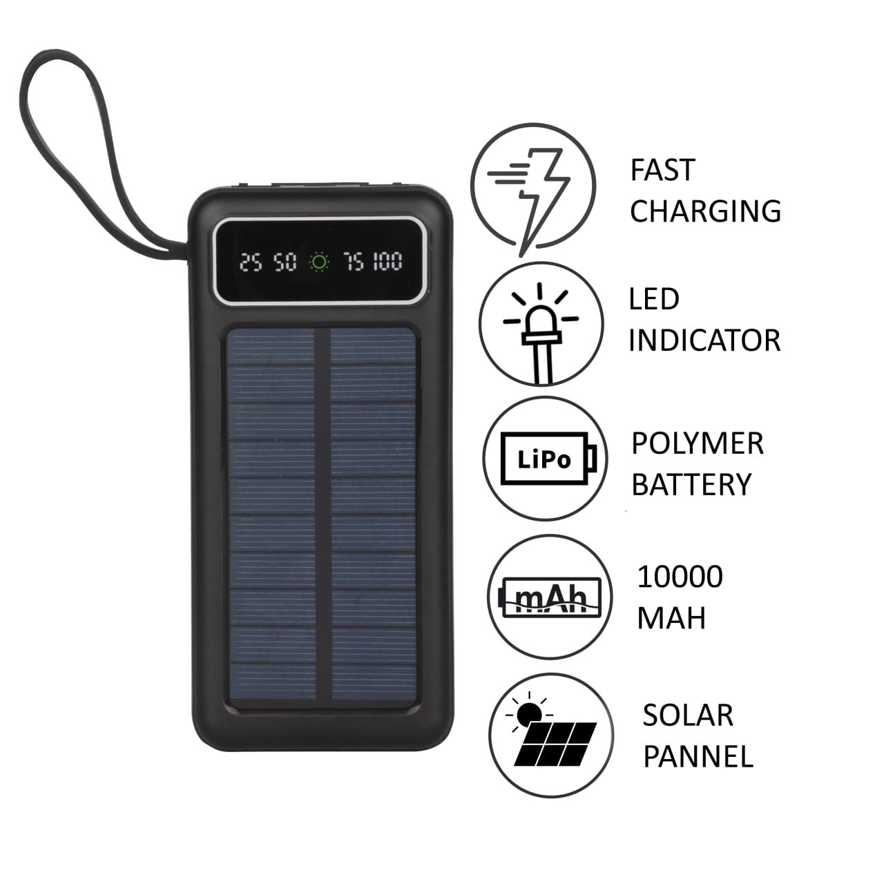 Home/Solar Power Bank/TurboGiga Solar Power Bank 10,000 mAh With Torch Light with 4-in-1 Cable – 4 USB Outputs, 15W Fast Charging, Type-C & Micro Input, LED Display, For Android Mobiles, Iphone, Smartwatch, Bluetooth Speaker