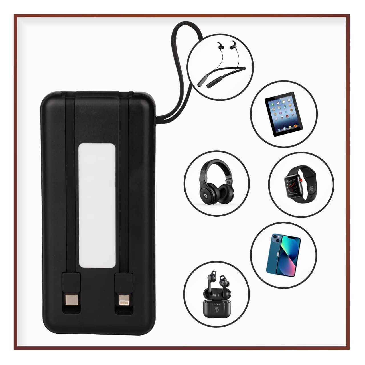 TurboGiga 10,000 mAh solar power bank with built-in cables, multiple outputs, and emergency solar charging. Rugged, water-resistant design—ideal for outdoor use and charging multiple devices on the go.